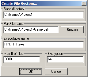 Zum Anlegen eines Archivs muss der Pfad, in dem sich das Spiel im Originalzustand befindet und aus dem die Dateien anschließend ausgewählt werden, angegeben werden, sowie ein Zielpfad für das Archiv und der Name der eigentlichen ausführbaren Datei des Spiels (meist RPG_RT.exe). Wichtig dabei ist auch, dass diese ebenfalls mit verpackt werden muss.